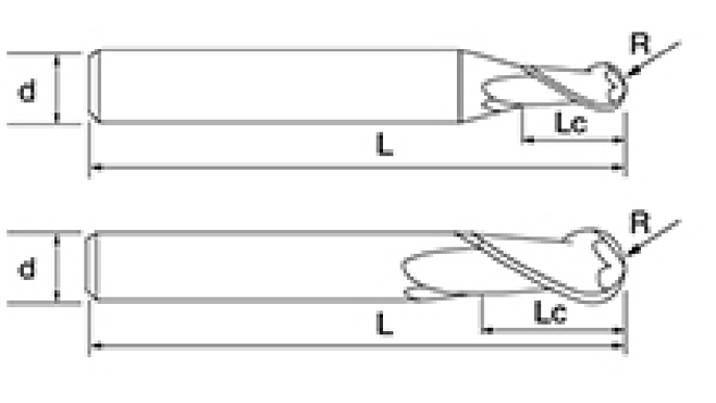 | Série ré'outils | Diamètre | R.ayon | R.ayon de coin | Longueur de la flûte | Longueur efficace | Longueur totale | Diamètre de la tige | |||