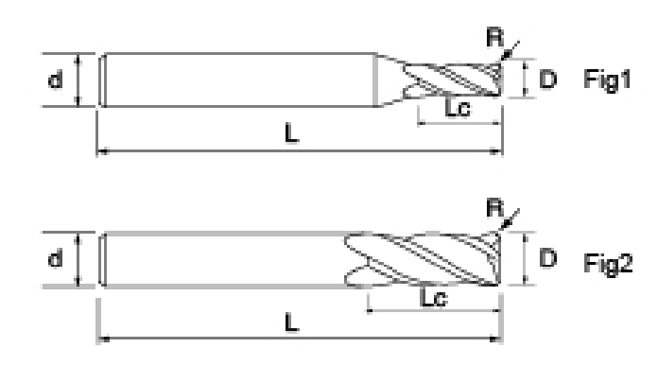 | Série ré'outils | Diamètre | R.ayon | R.ayon de coin | Longueur de la flûte | Longueur efficace | Longueur totale | Diamètre de la tige | |||