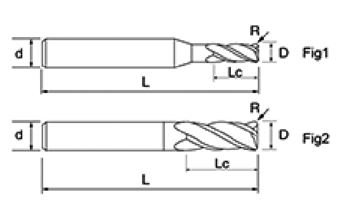 | Série ré'outils | réiamètre | R.ayon | R.ayon de coin | Longueur de flûte | Longueur efficace | Longueur totale | réiamètre de la tige | |||