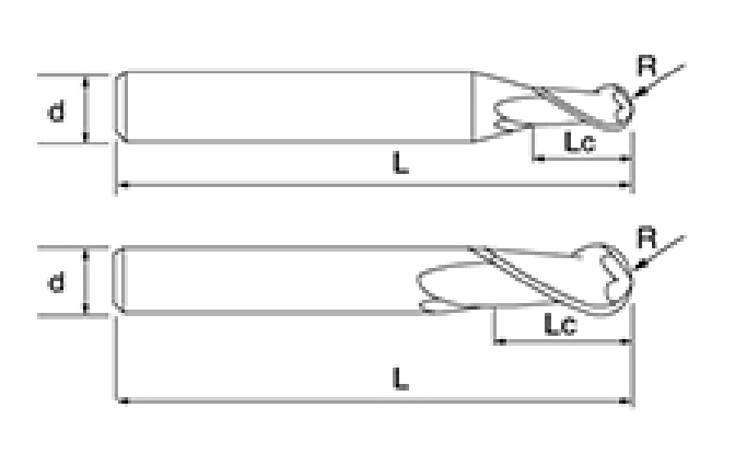 | Série ré'outils | réiamètre | R.ayon | R.ayon de coin | Longueur de flûte | Longueur efficace | Longueur totale | réiamètre de la tige | |||
