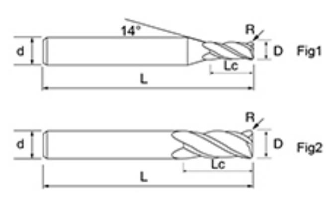 | Série ré'outils | Diamètre | R.ayon | R.ayon de coin | Longueur de flûte | Longueur efficace | Longueur totale | Diamètre de la tige | |||